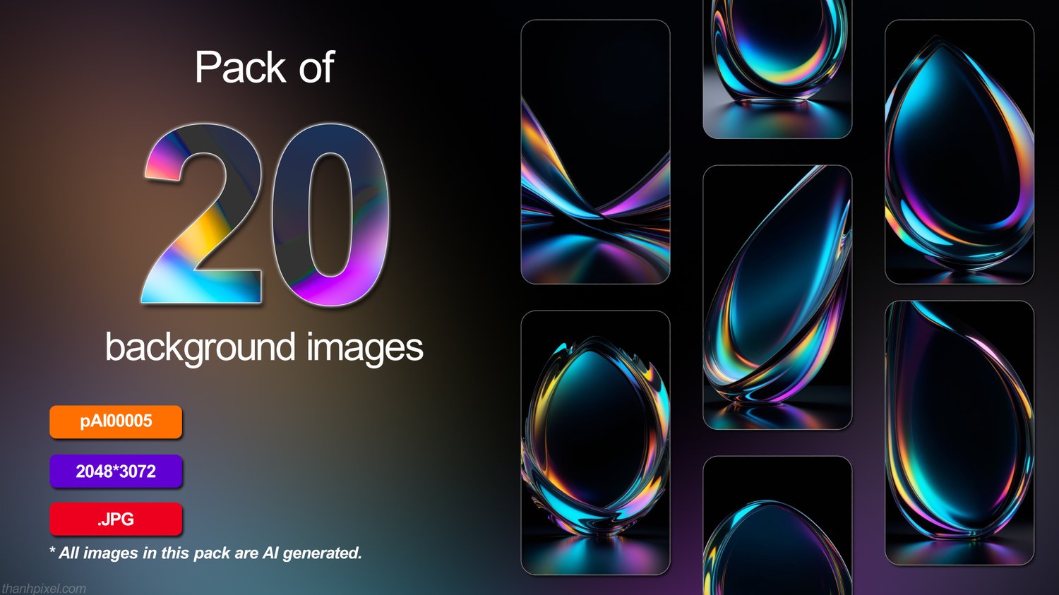 Pack of 20 abstract silky smooth transparent hologram shiny black background wallpaper space 3d luxury majestic cinematic professional color grading, vertical composition. All images in this pack are AI generated.
