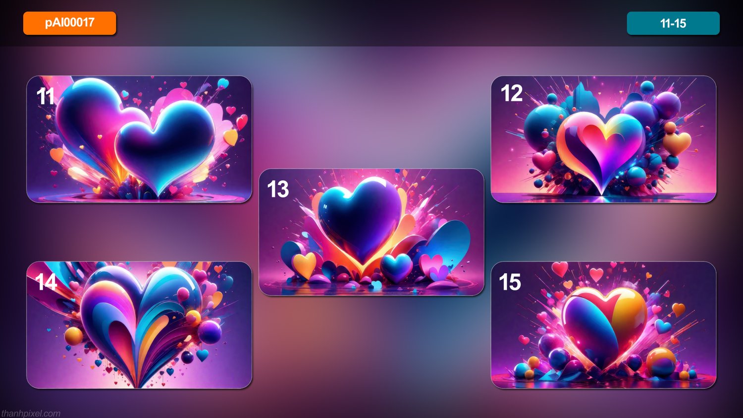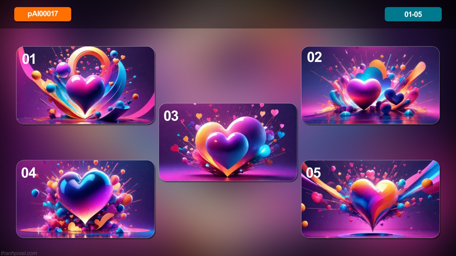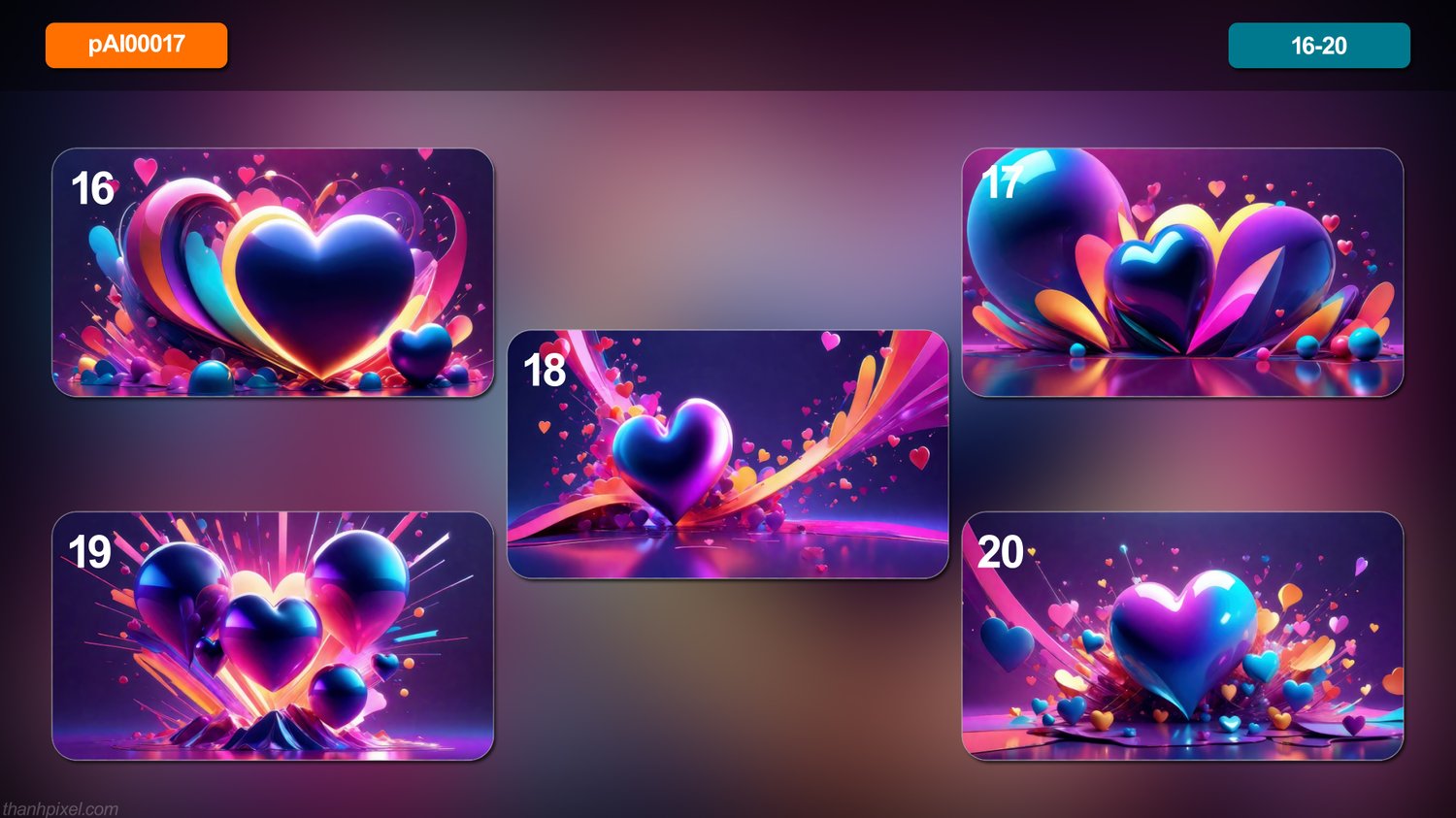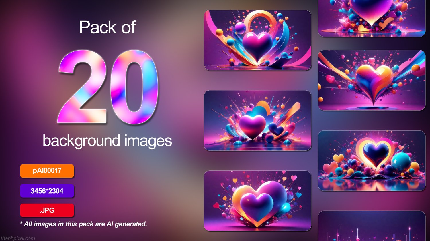 Pack of 20 abstract glossy minimalist size 3d heart shapes objects featuring explosion, horizontal composition. All images in this pack are AI generated.