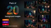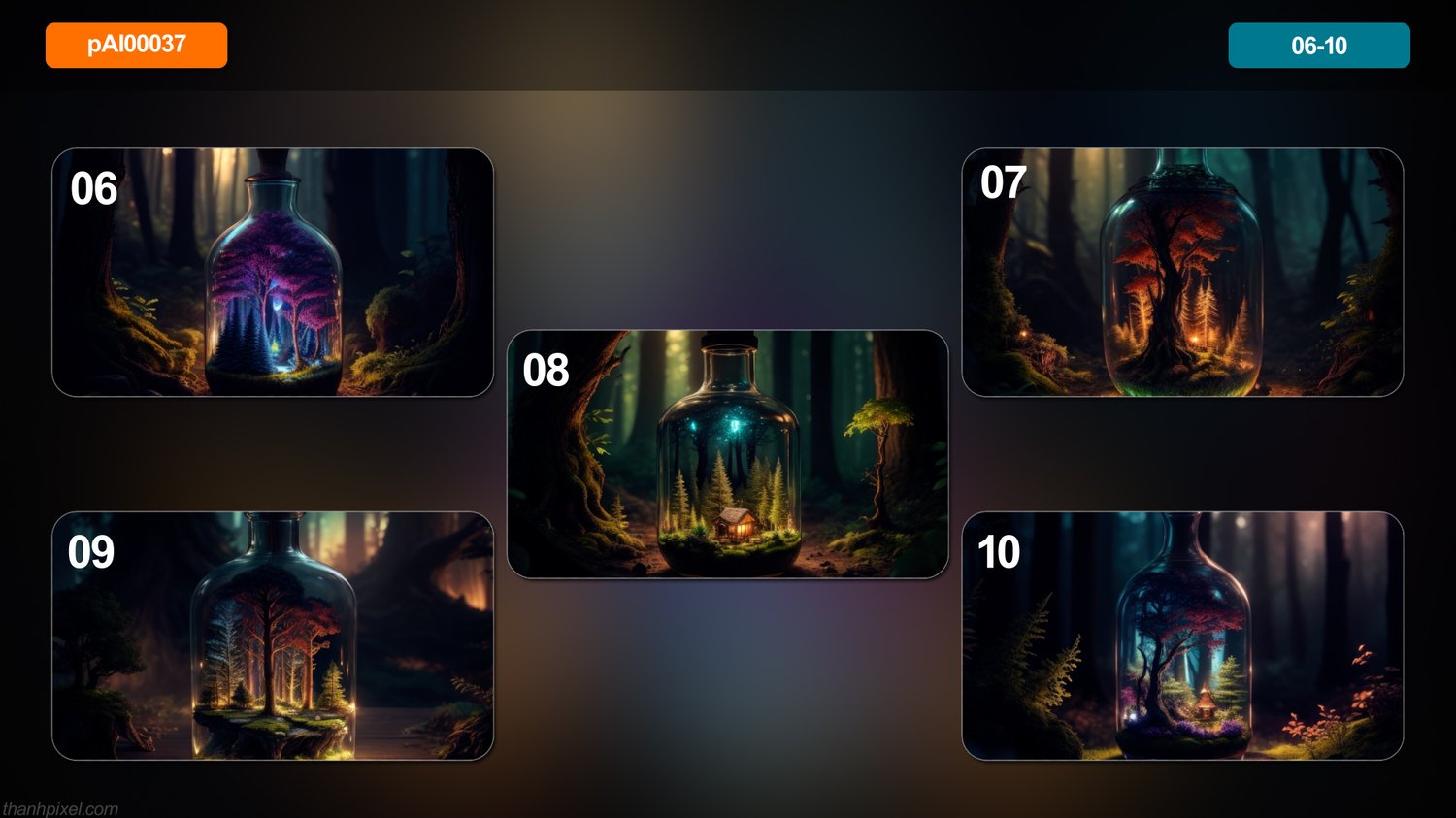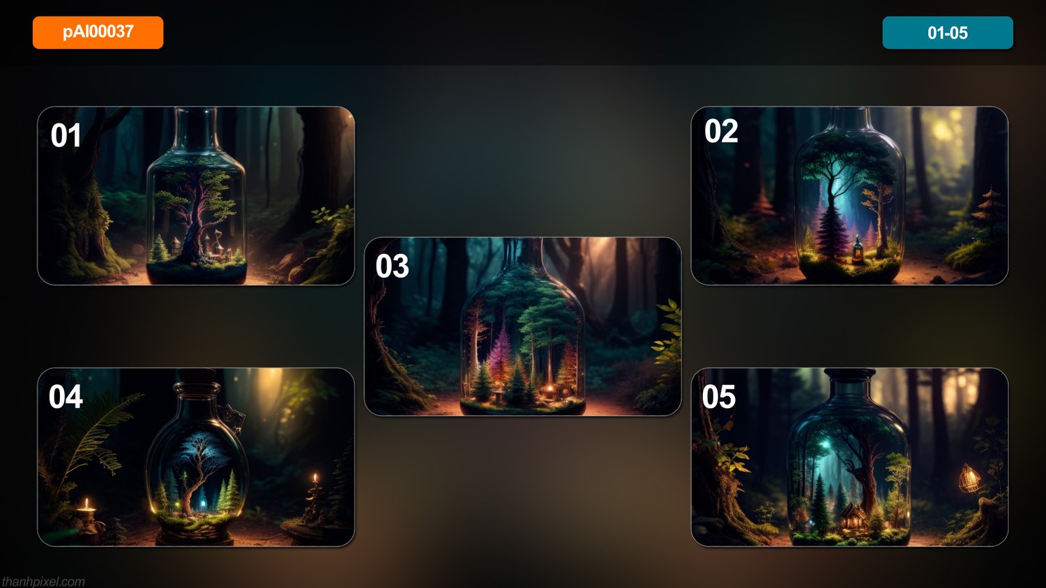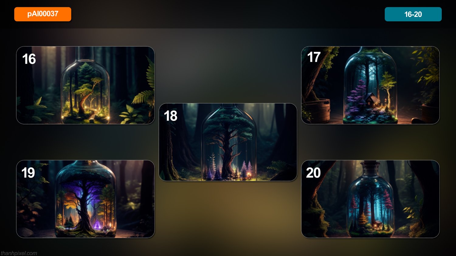 Pack of 20 vibrant abstract forest nature intricate minitown landscape trapped bottle atmospheric oliva lighting table dark vibes colours, horizontal composition. All images in this pack are AI generated.