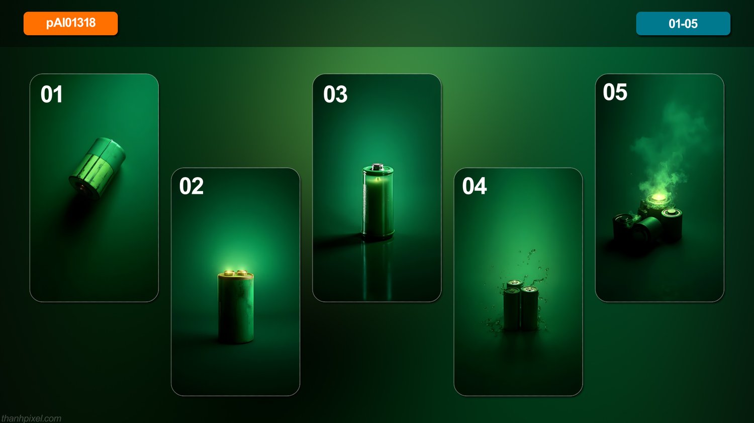 [AI] Pack of 5 green battery glows dark background casting shadow clean space glow light leaf, vertical composition.