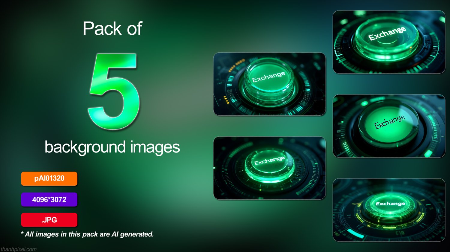 Pack of 5 green glowing exchange button futuristic digital interface glow technology, horizontal composition. All images in this pack are AI generated.