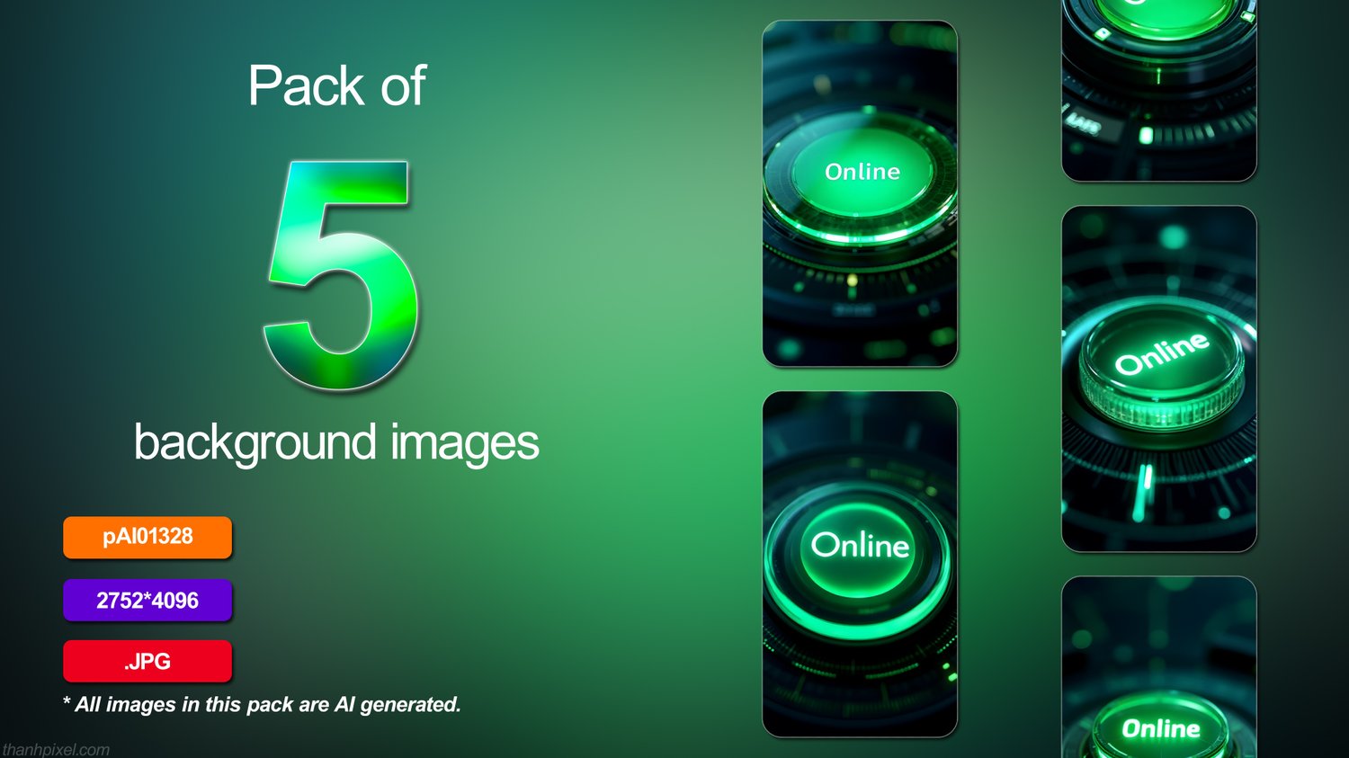 Pack of 5 green online button glowing futuristic digital interface glow technology light, vertical composition. All images in this pack are AI generated.